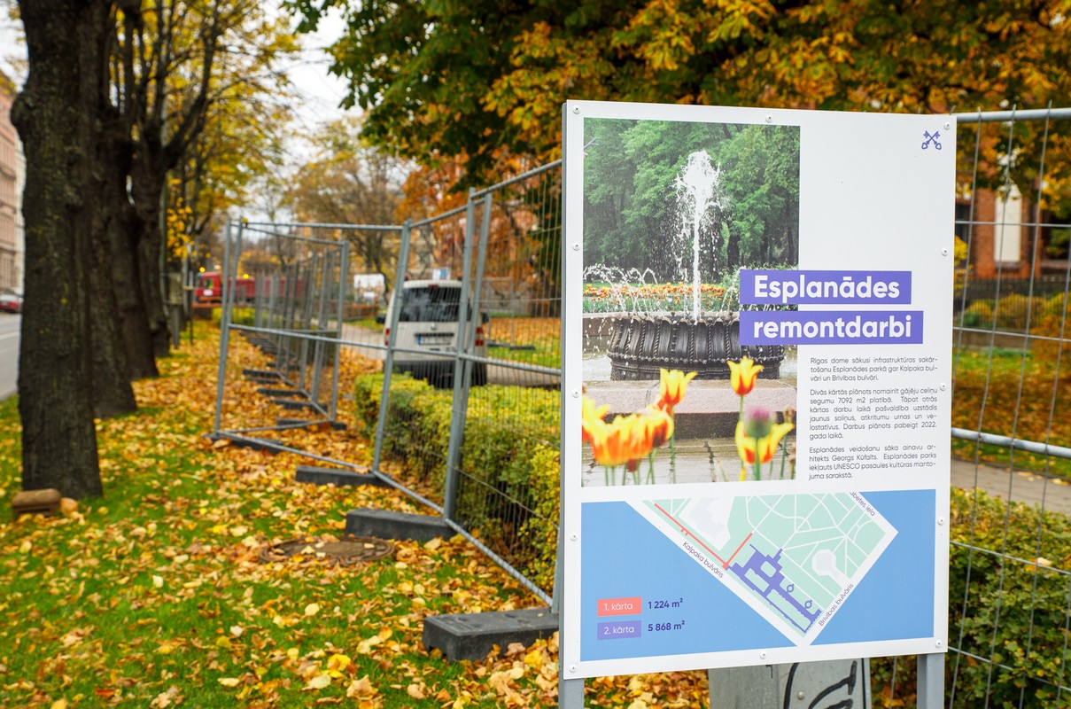 Otrdien, 26. oktobrī, Esplanādē sākta novecojušā celiņu seguma nomaiņa, tādējādi sperot pirmo soli septiņus hektārus plašā Rīgas centra parka vizuālā tēla atjaunošanā.