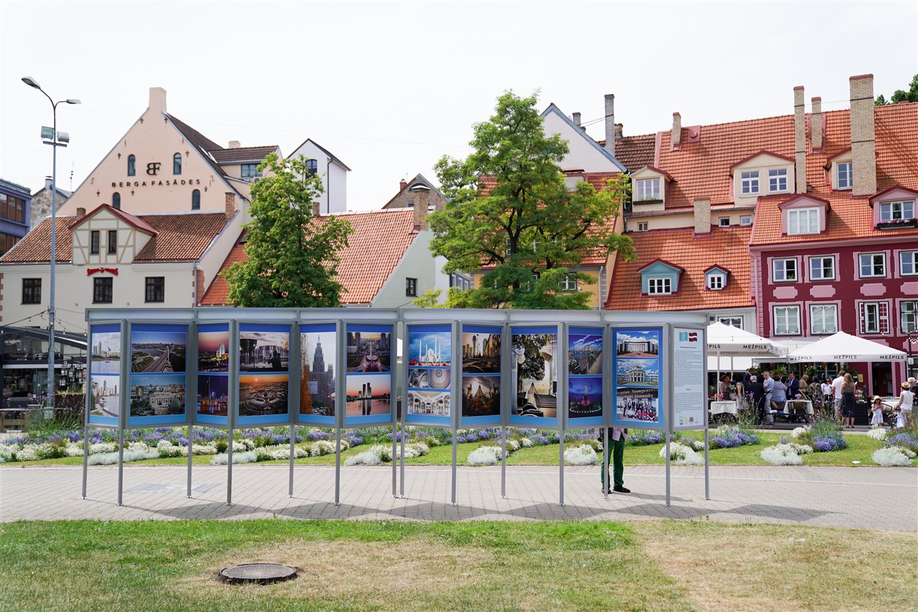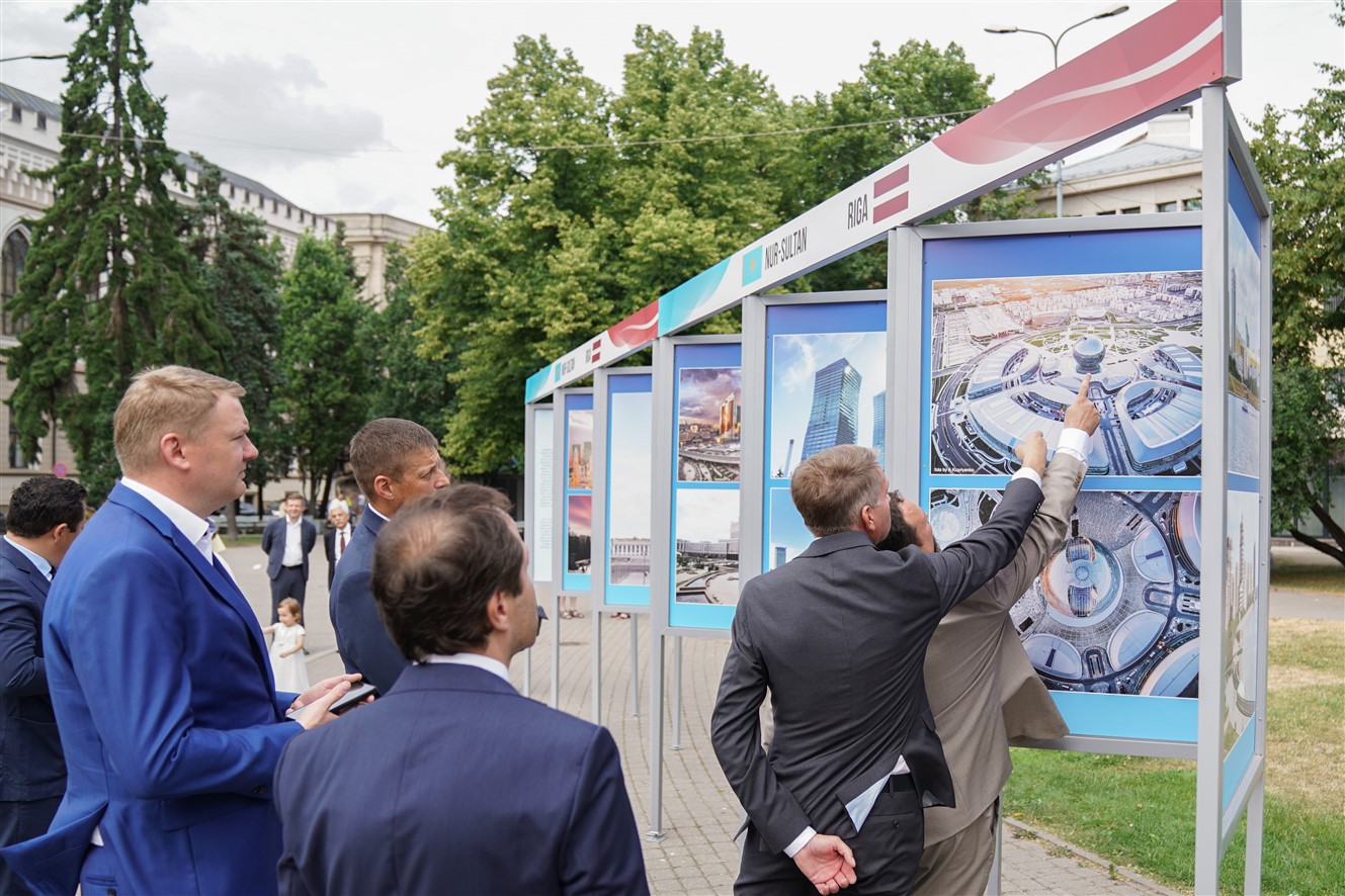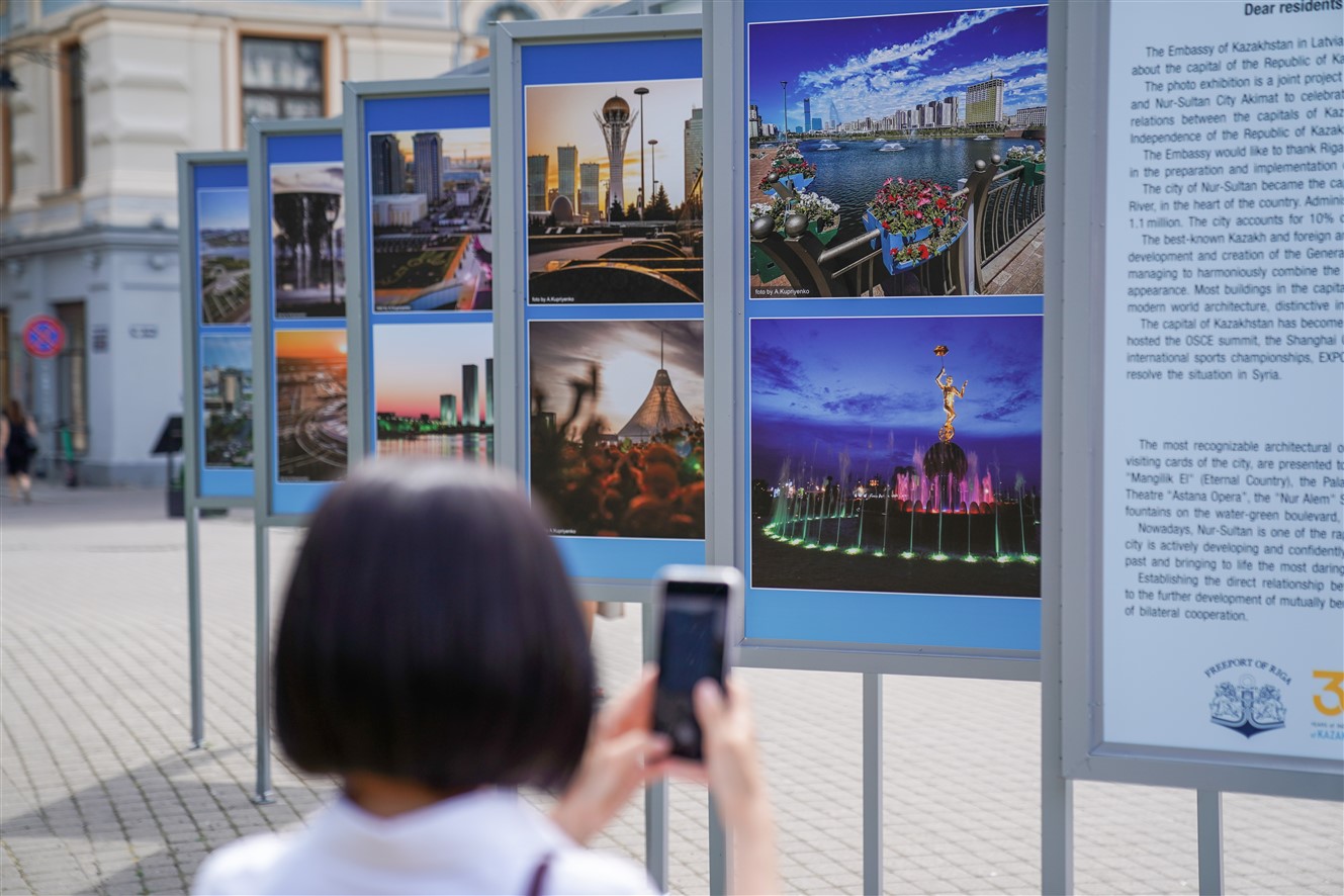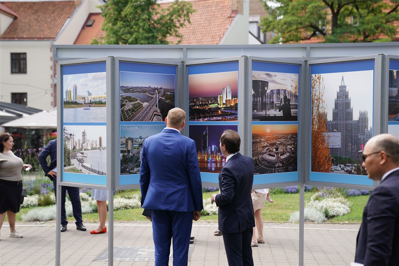 Otrdien, 6. jūlijā, Rīgas domes priekšsēdētāja vietnieks Edvards Smiltēns un pilnvarotais Kazahstānas Republikas vēstnieks Latvijā Timurs Primbetovs Līvu laukumā atklāja fotoizstādi par Kazahstānas galvaspilsētu Nursultanu.