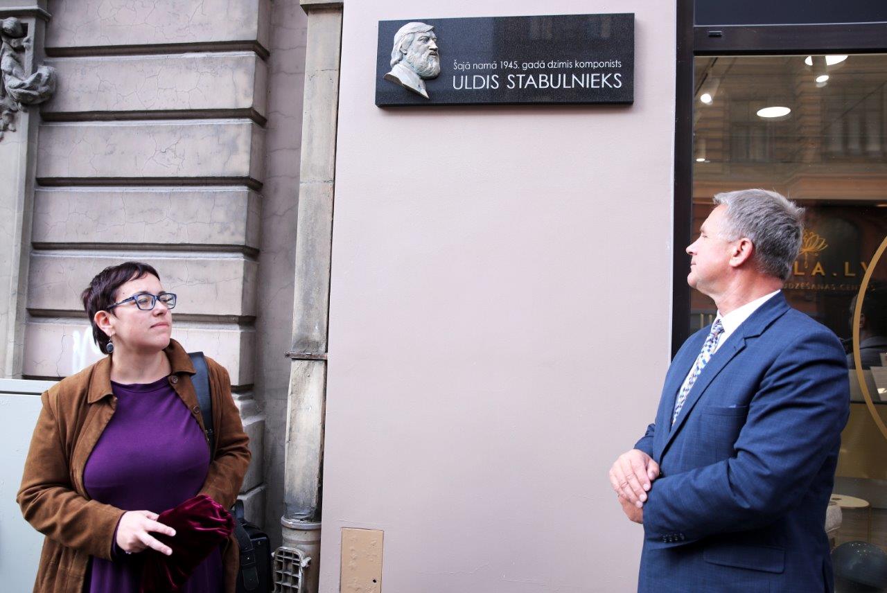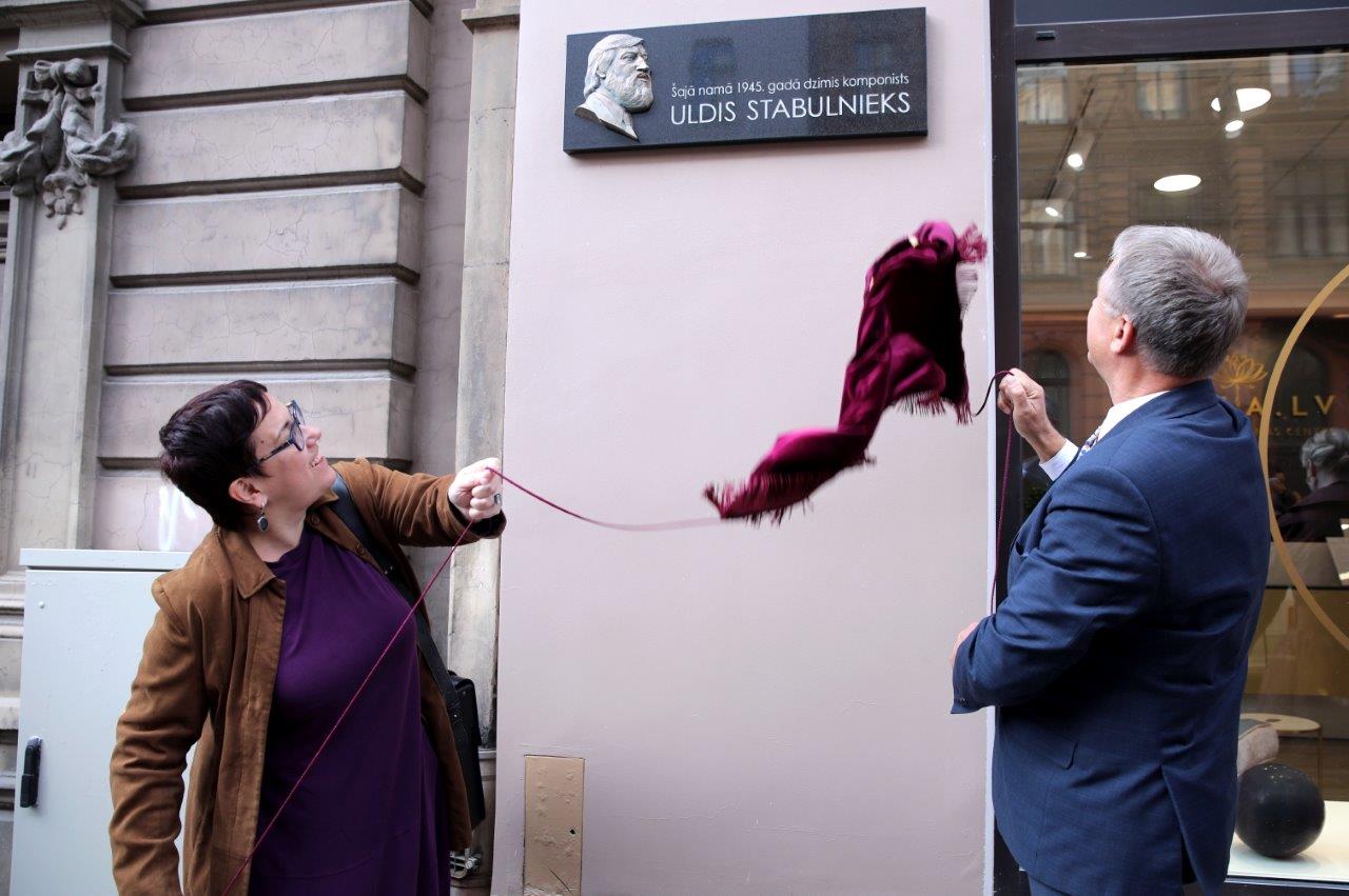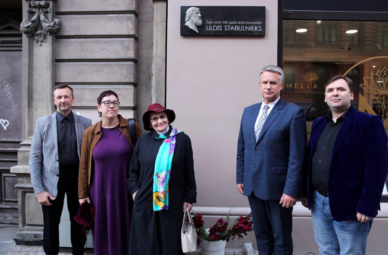 Ceturtdien, 8.oktobrī, Latvijas kultūras ministrs Nauris Puntulis un Rīgas domes Izglītības, kultūras un sporta komitejas priekšsēdētāja Iveta Ratinīka kopā ar komponista ģimenes pārstāvjiem un talanta cienītājiem pie A.Čaka ielas 33 nama atklāja komponista Ulda Stabulnieka piemiņai veltītu plāksni.