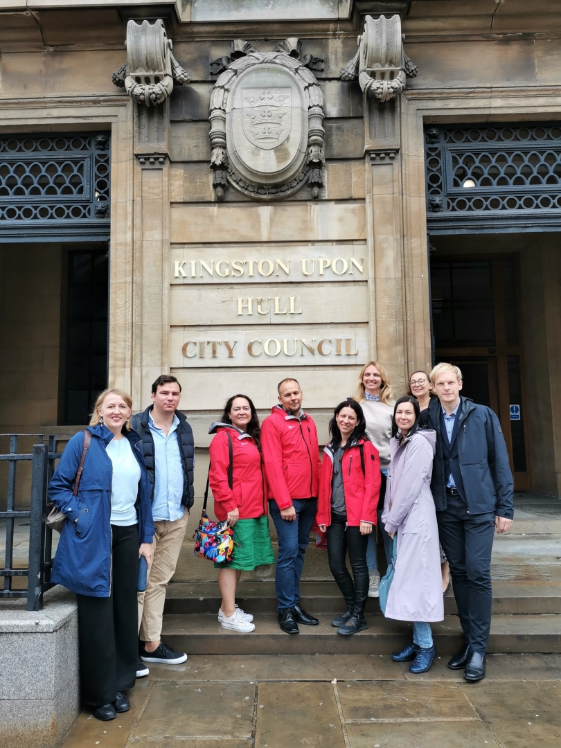 Rīgas apkaimju koordinatori pie Hallas pilsētas domes ēkas.