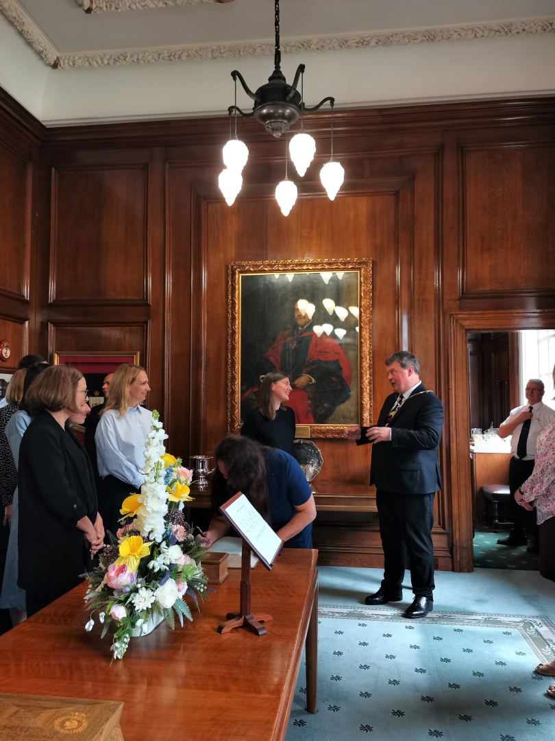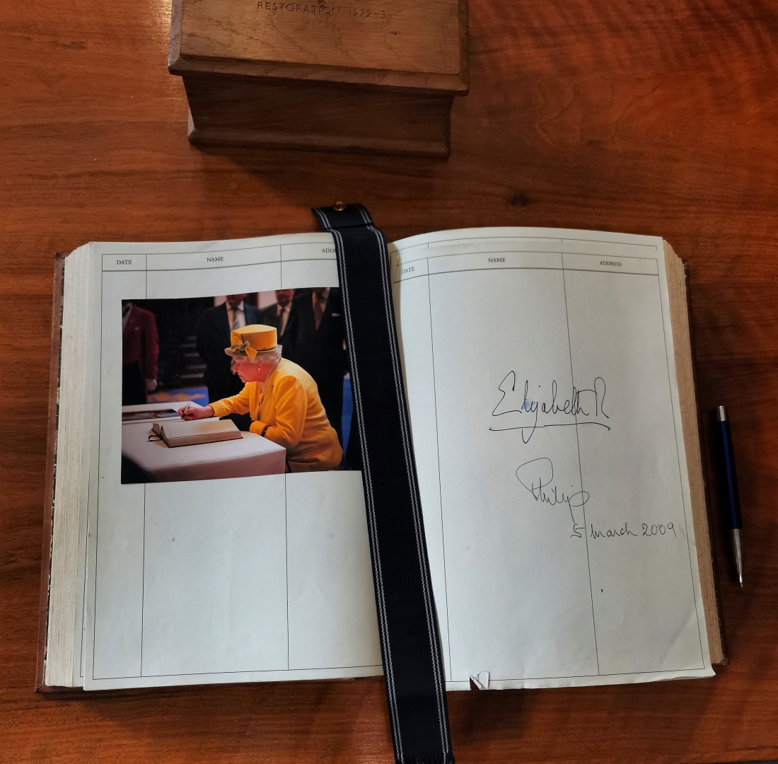 Mācību vizītes dalībnieku parakstītā viesu grāmata Hallas pilsētas domē, kurā savulaik parakstījusies arī Karaliene Elizabete II.