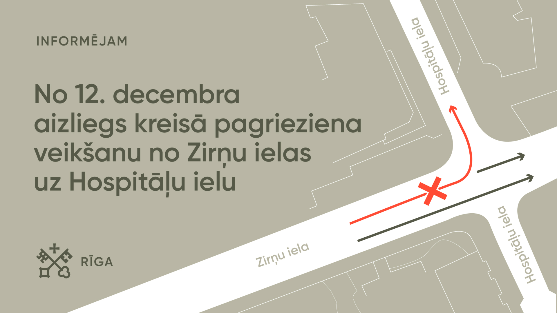 Piektdien, 12. decembrī, Zirņu uz Hospitāļu ielas krustojumā veiks satiksmes organizācijas izmaiņas. Turpmāk no Zirņu ielas nevarēs veikt kreiso pagriezienu uz Hospitāļu ielu. Izmaiņas ieviesīs virzienā uz Miera ielu.