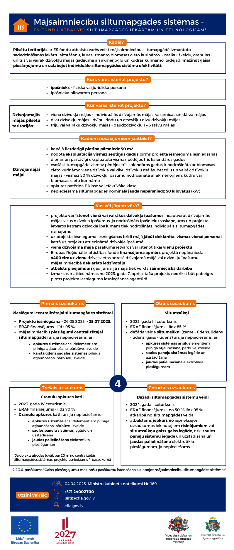 * CFLA izsludinājusi atklātas projektu iesniegumu atlases otro uzsaukumu Eiropas Savienības kohēzijas politikas programmas 2021. – 2027. gadam 2.2.3. specifiskā atbalsta mērķa “Uzlabot dabas aizsardzību un bioloģisko daudzveidību, “zaļo” infrastruktūru, it īpaši pilsētvidē, un samazināt piesārņojumu” 2.2.3.6. specifiskā atbalsta mērķa pasākuma “Gaisa piesārņojumu mazinošu pasākumu īstenošana, uzlabojot mājsaimniecību siltumapgādes sistēmas”, atklātai projektu atlasei, kurā paredzēts atbalsts dažādu veidu siltumsūkņu uzstādīšanai mājsaimniecībās.