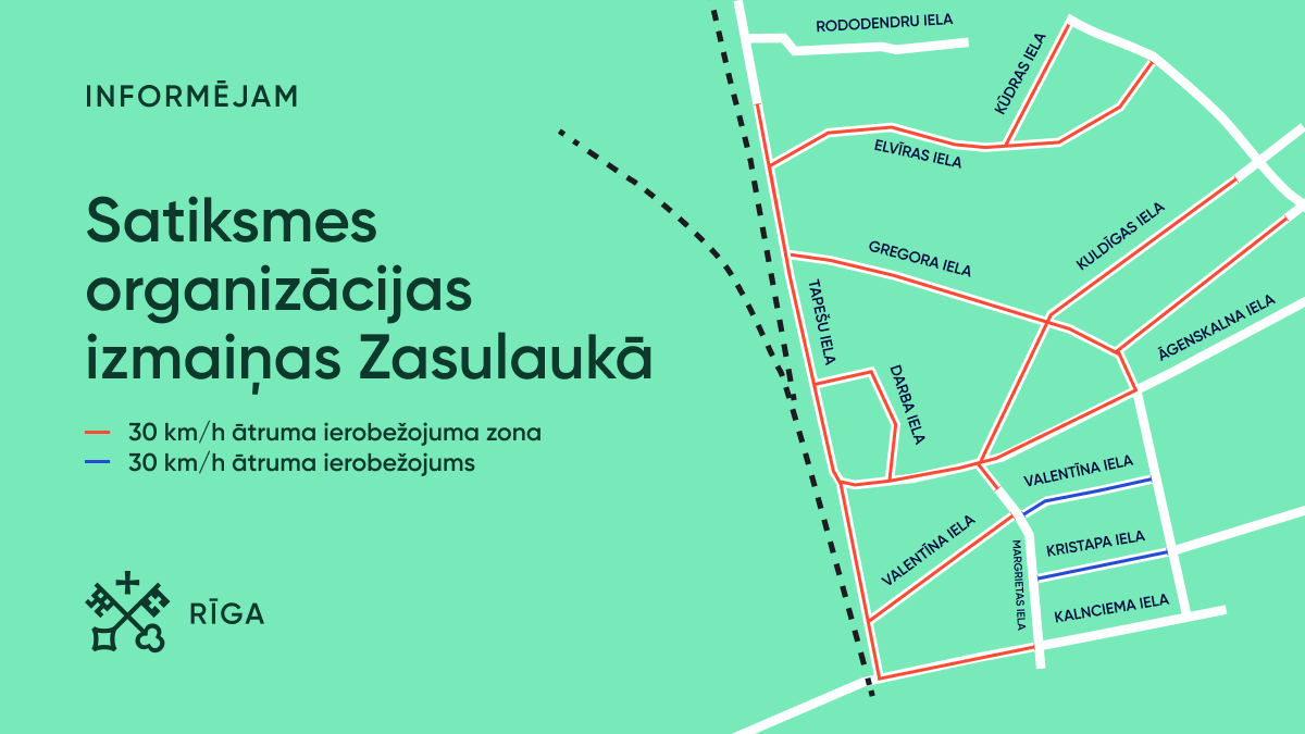 No 30. aprīļa Zasulauka apkaimē tiks ieviestas satiksmes organizācijas izmaiņas, nosakot ātruma ierobežojuma zonu 30 km/h.