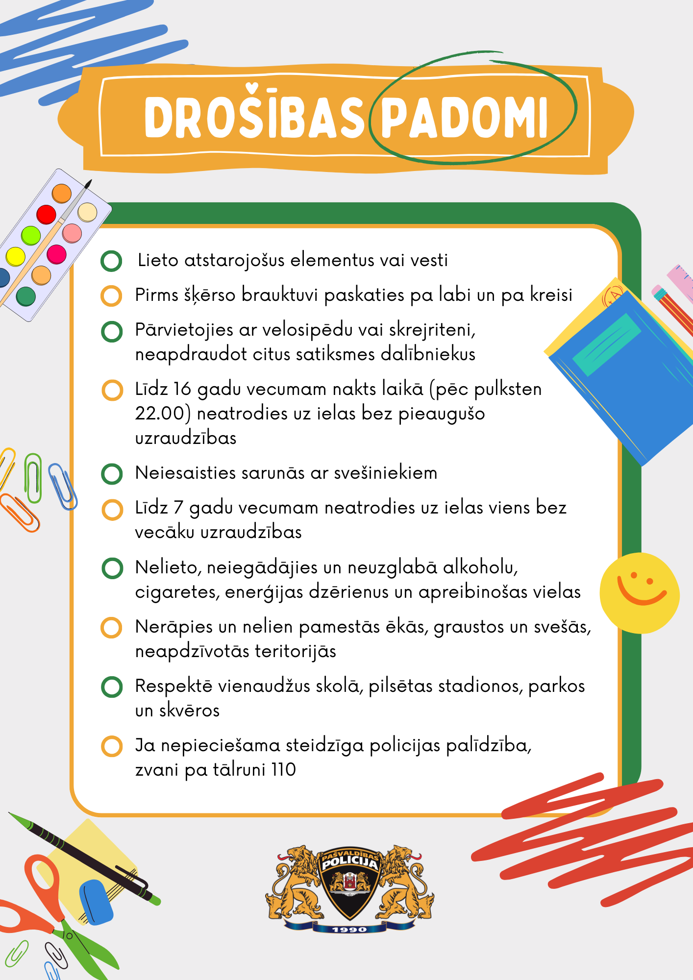 Savukārt vecākus policija aicina pārrunāt drošības jautājumus ar savām atvasēm – gan par drošību ceļu satiksmē, gan apreibinošo vielu kaitīgo ietekmi, gan arī par citiem noteikumiem, kas jāievēro bērniem un jauniešiem, kā arī vienkārši par savstarpēju cieņu vienaudžu vidū.