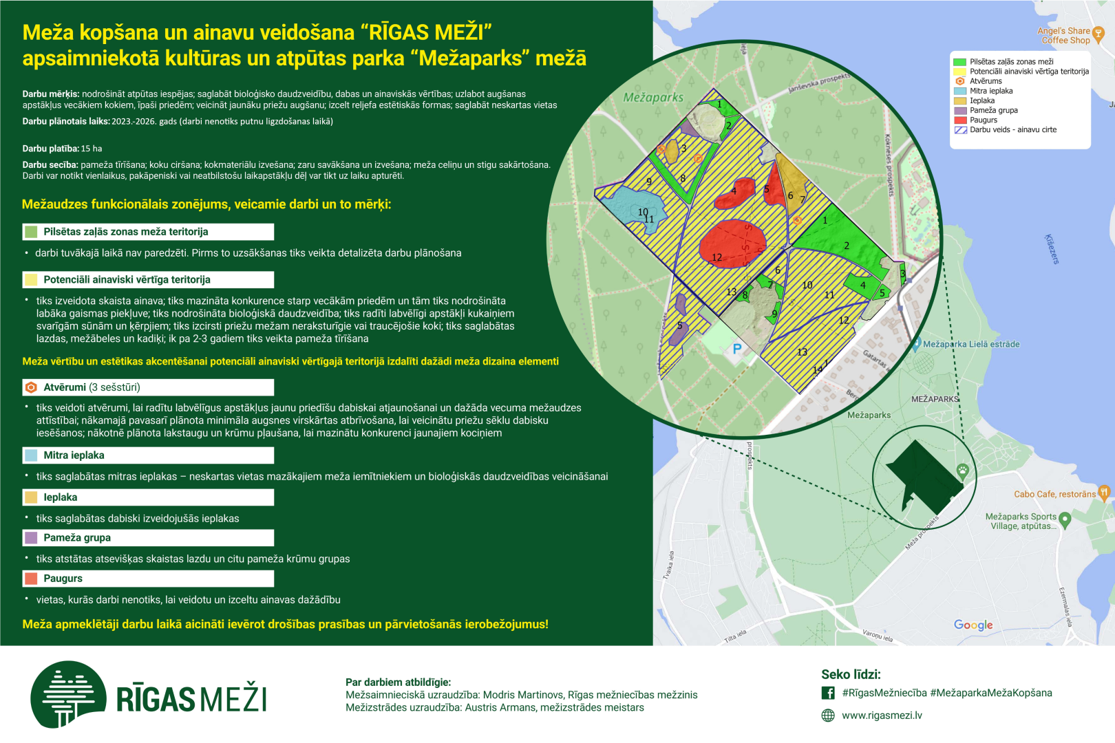 Arī turpmāk “Rīgas meži” turpinās iepazīstināt sabiedrību ar Mežaparka meža kopšanas gaitu. Visērtāk sekot līdzi jaunumiem iespējams sociālajos tīklos, īpaši Facebook, izmantojot mirkļbirku #MežaparkaMežaKopšana.