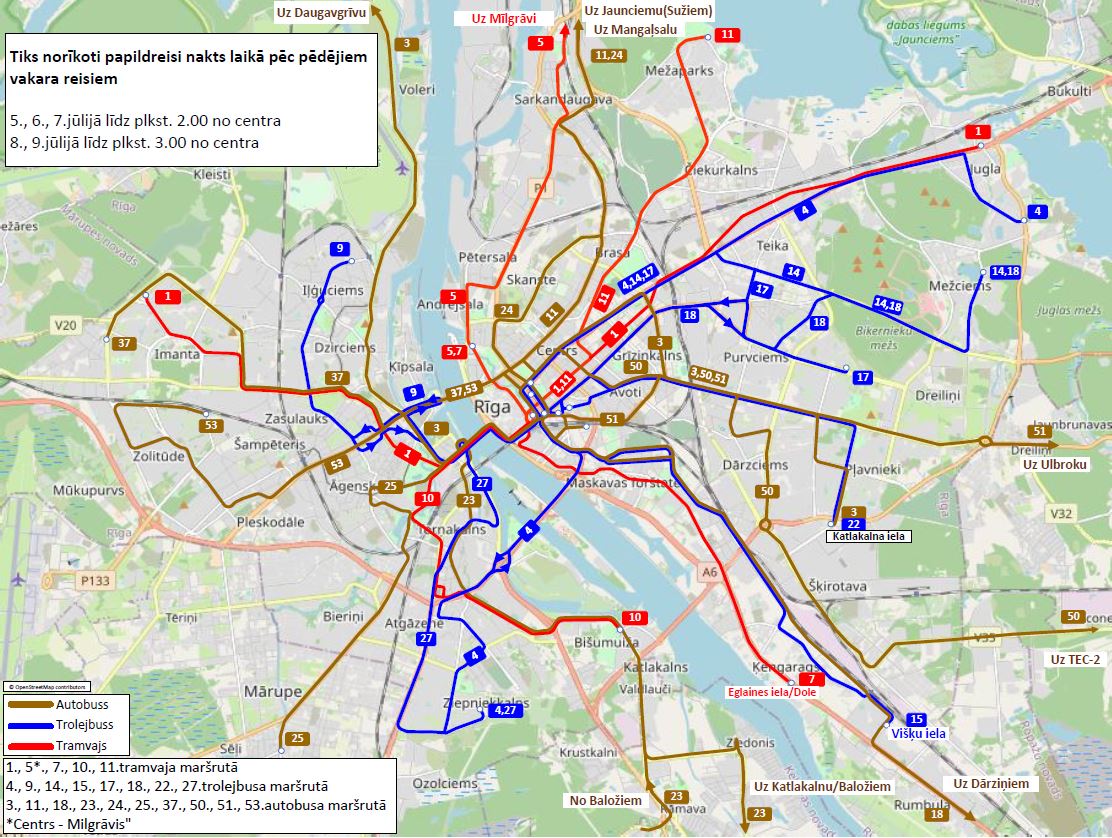Lai nodrošinātu svētku dalībnieku un apmeklētāju nokļūšanu mājās sabiedriskā transporta kustība no centra uz lielākajām pilsētas apkaimēm tiks nodrošināta līdz aptuveni plkst. 2.00 no pilsētas centra sekojošos maršrutos: