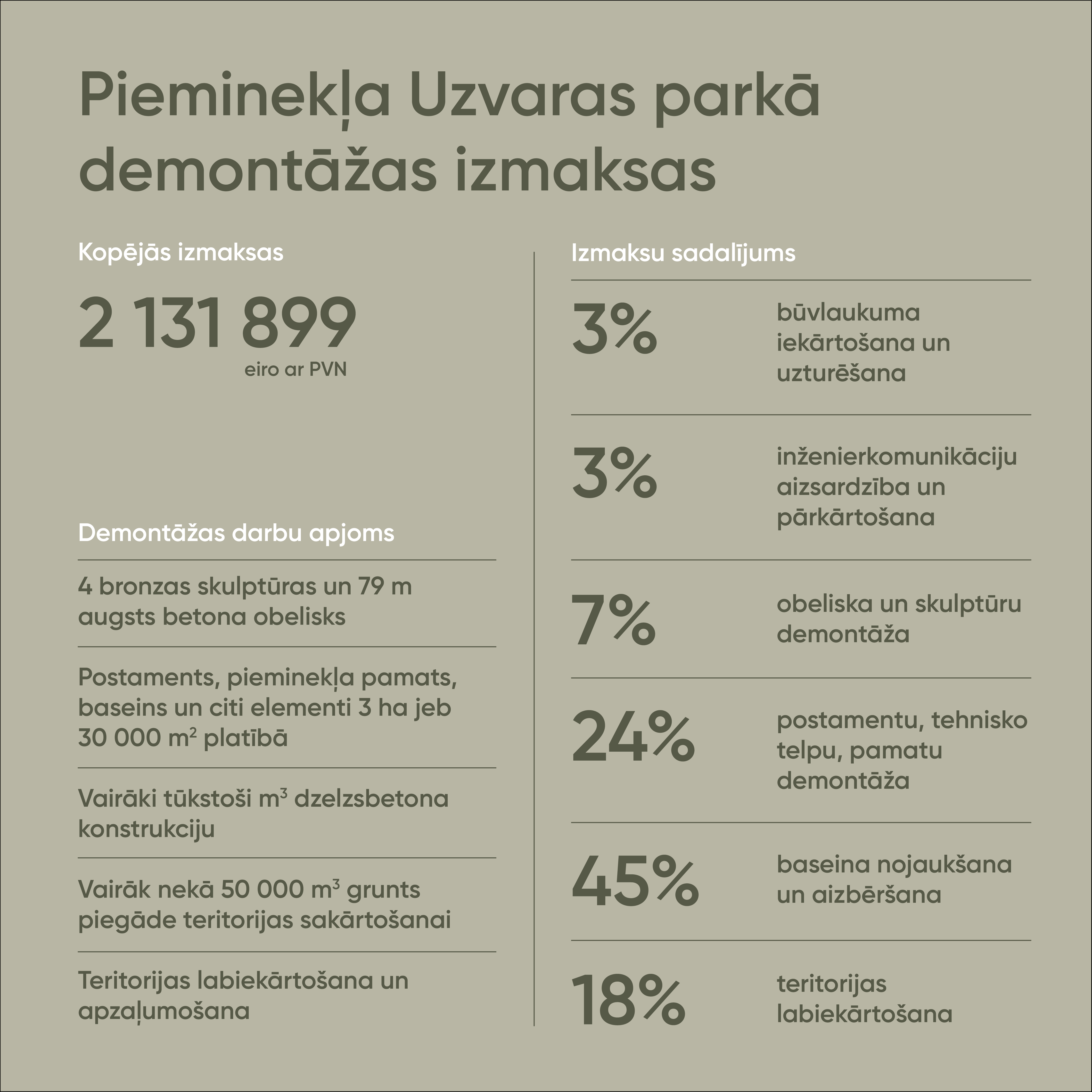 Objekta demontāžas izmaksas ir 2 131 899 eiro ar PVN. Darbi neietver tikai obeliska un skulptūru nojaukšanu, tā paredz arī postamenta, pamatu, baseina un citu labiekārtojumu demontāžu gandrīz trīs hektāru jeb 30000 kvadrātmetru platībā, tiks demontēti vairāki tūkstoši kubikmetru dzelzsbetona konstrukciju, pievesti vairāk nekā 50 000 kubikmetri dažādu grunšu teritorijas sakārtošanai, kā arī veikti labiekārtošanas un apzaļumošanas darbi.