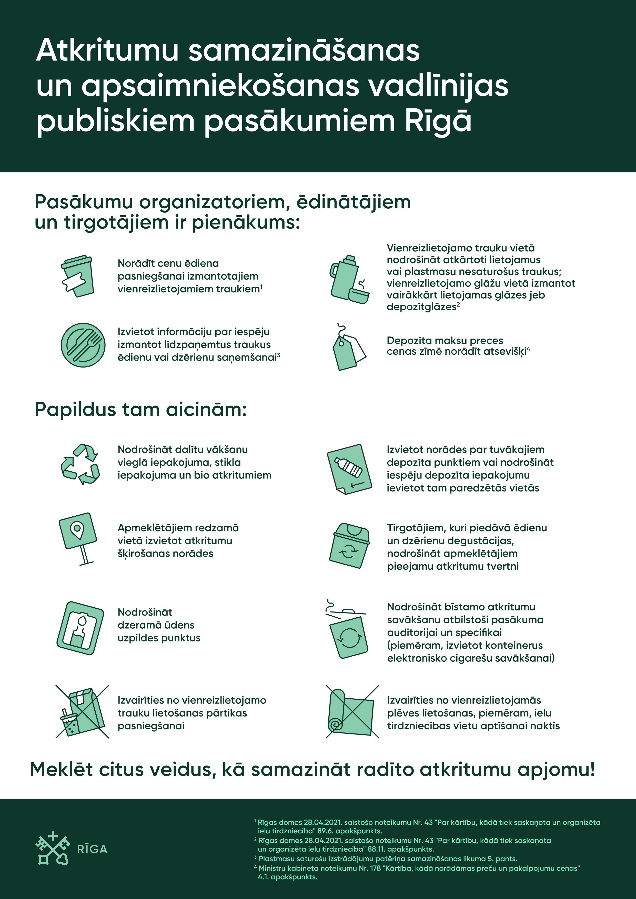 - rudens/ziemas sezonālos dekorējumus bez teritoriju norobežojošas funkcijas, augstumā nepārsniedzot 1,5 m virs ietves līmeņa (sildītājus, dekorējumus un puķu kastes pieļaujams izvietot tikai kopā ar galdiem un krēsliem);